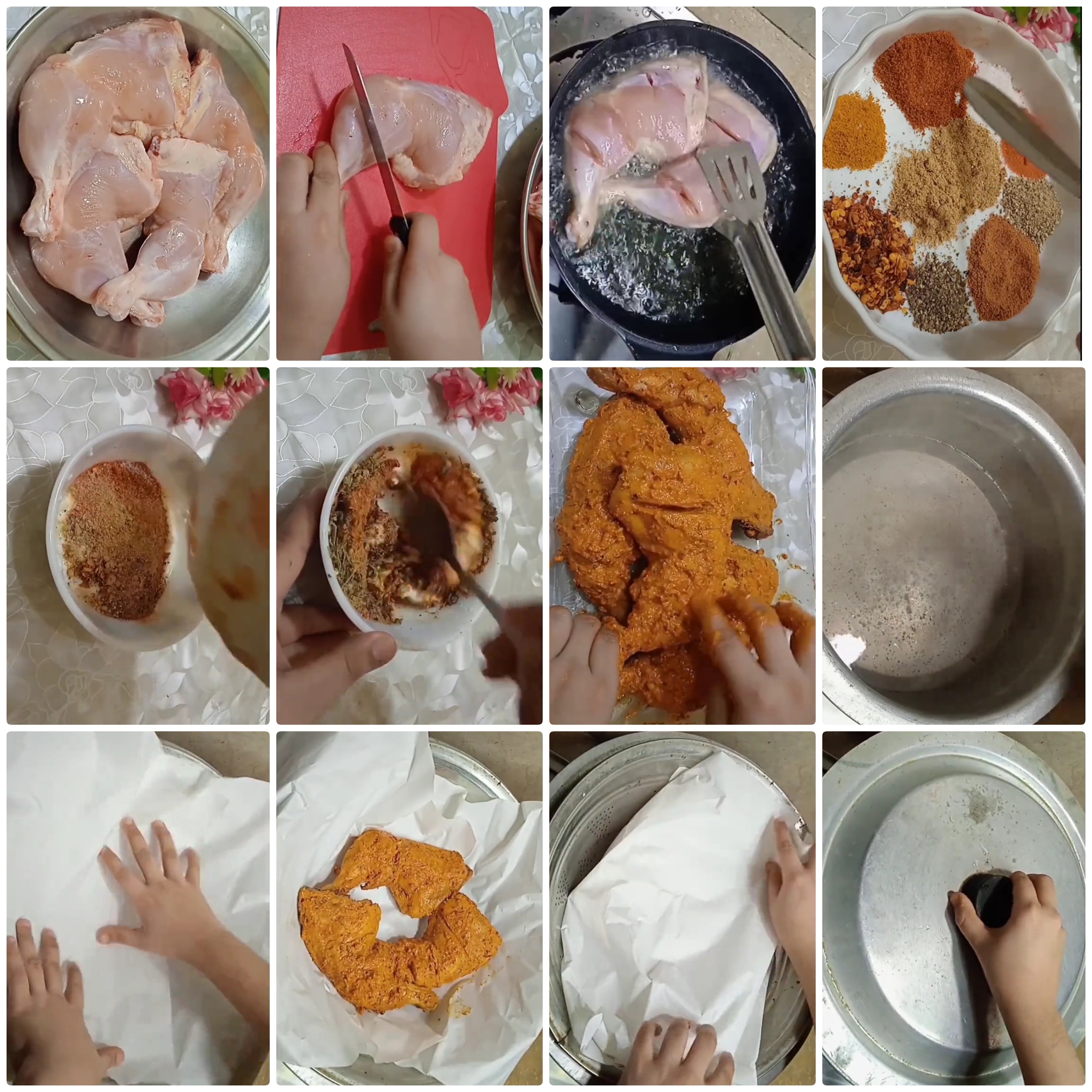 1. Wash the chicken well and cut it with the help of a knife and then fry half of it in oil.